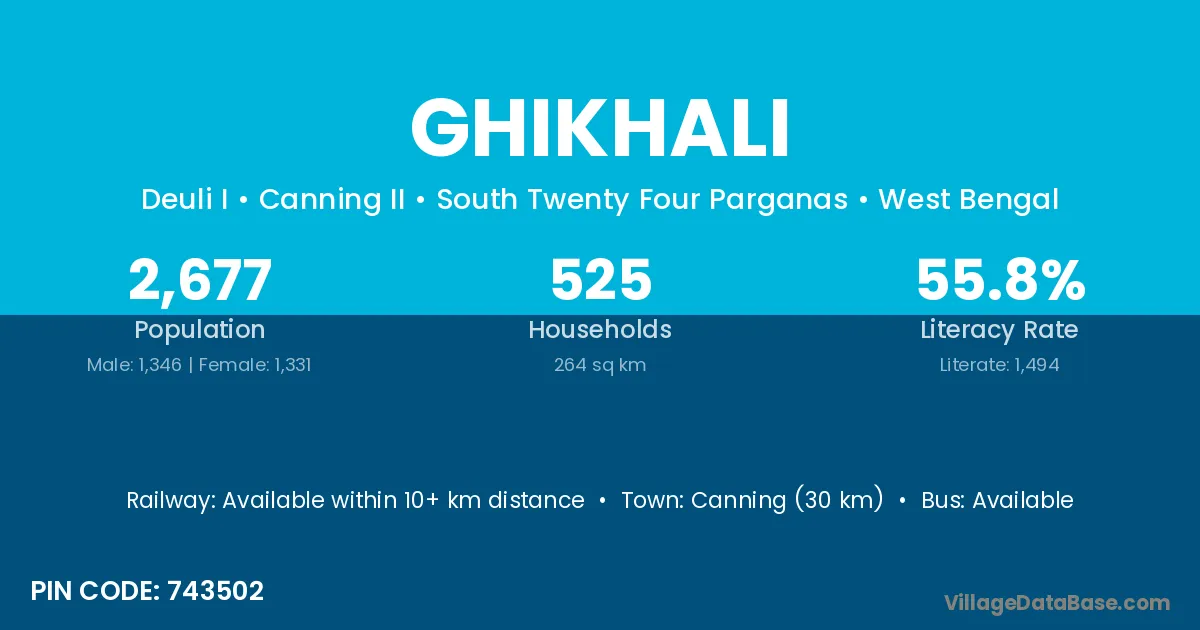 Canning (30 km) is the nearest town to Ghikhali village for major economic activities and is located approximately 30 km away.