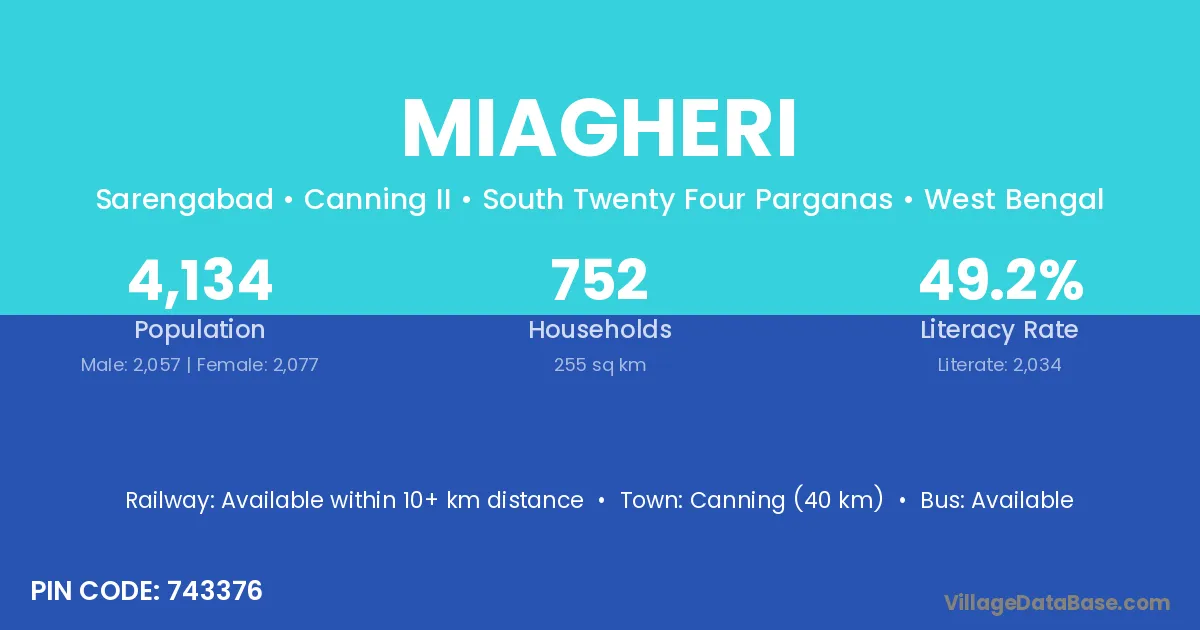 Canning (40 km) is the nearest town to Miagheri village for major economic activities and is located approximately 40 km away.