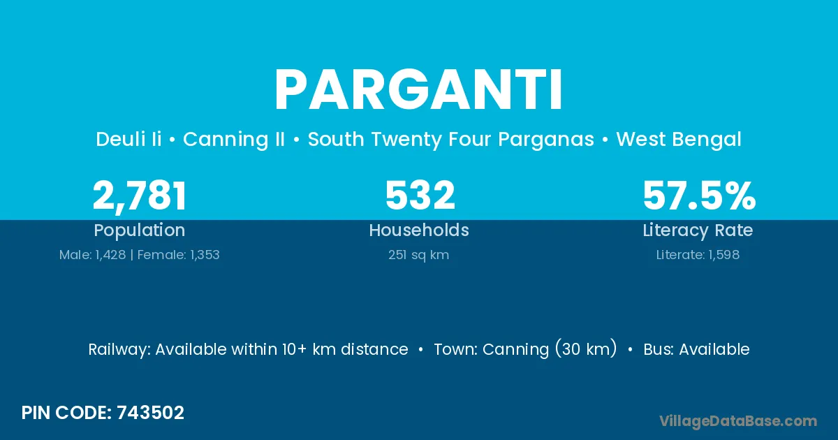 Canning (30 km) is the nearest town to Parganti village for major economic activities and is located approximately 30 km away.