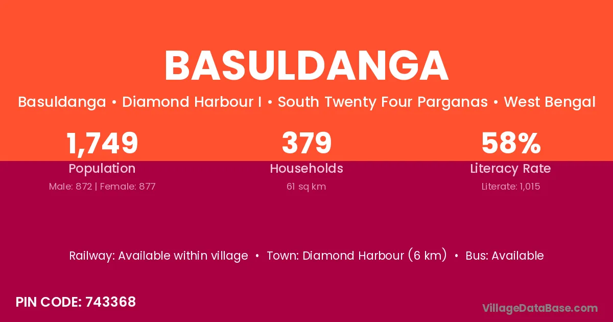 Diamond Harbour (6 km) is the nearest town to Basuldanga village for major economic activities and is located approximately 6 km away.