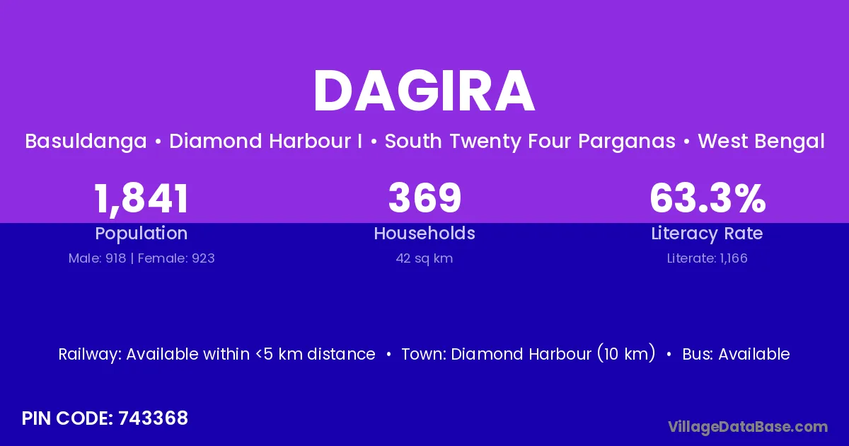 Diamond Harbour (10 km) is the nearest town to Dagira village for major economic activities and is located approximately 10 km away.