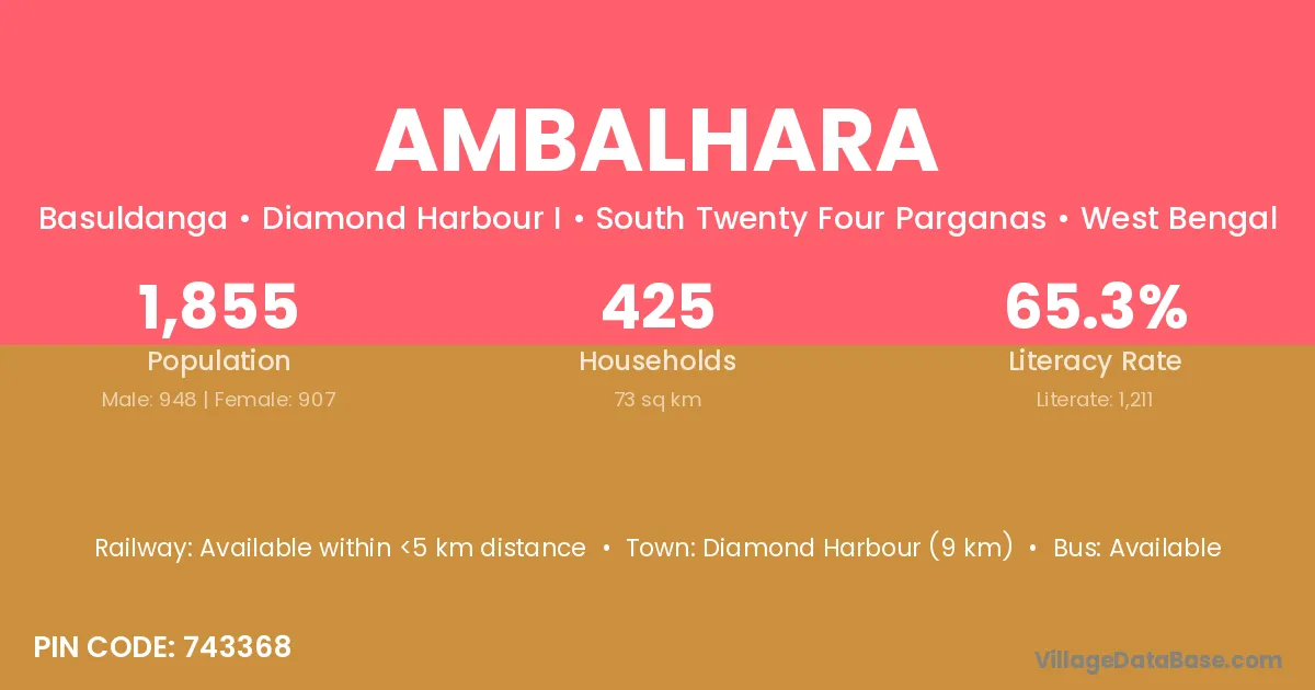 Diamond Harbour (9 km) is the nearest town to Ambalhara village for major economic activities and is located approximately 9 km away.