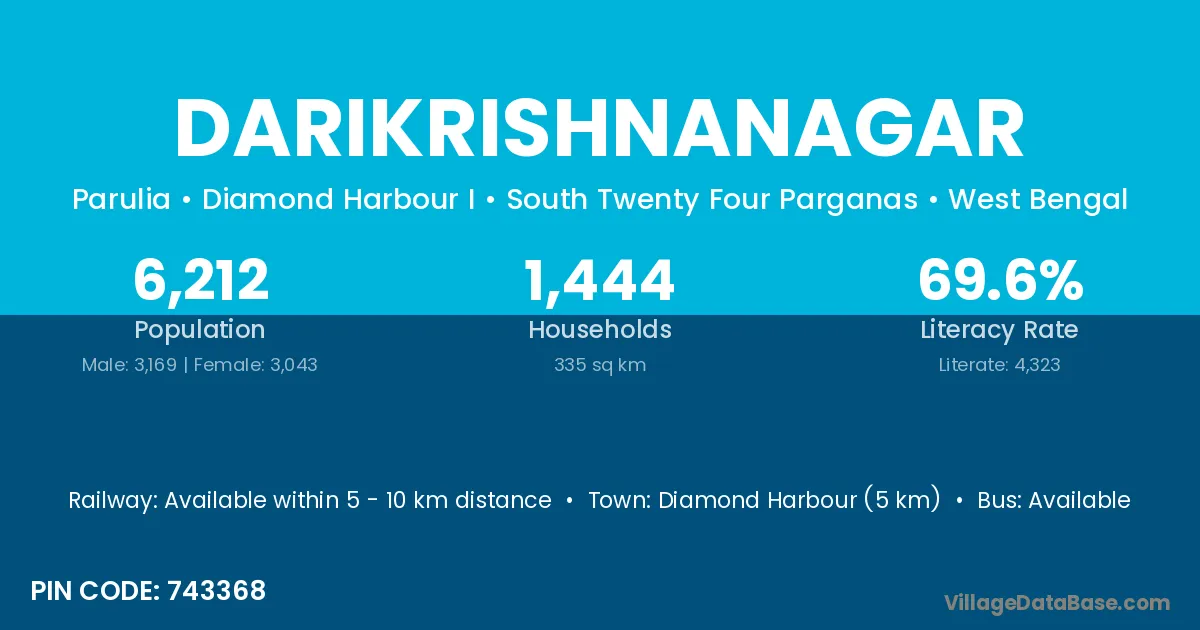Diamond Harbour (5 km) is the nearest town to Darikrishnanagar village for major economic activities and is located approximately 5 km away.