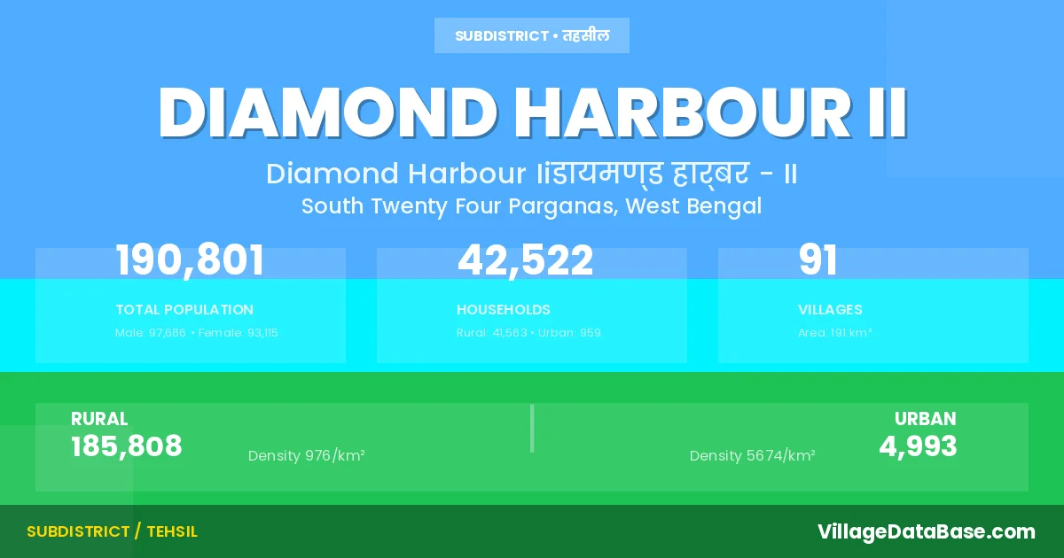 According to the 2011 census The total area of Diamond Harbour II Subdivision is 191 km², with a population of 190801 people. The population density is 997 inhabitants per square kilometre, and there are approximately 42522 houses in the sub district.