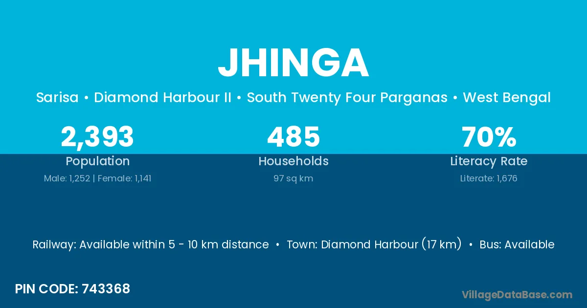 Diamond Harbour (17 km) is the nearest town to Jhinga village for major economic activities and is located approximately 17 km away.