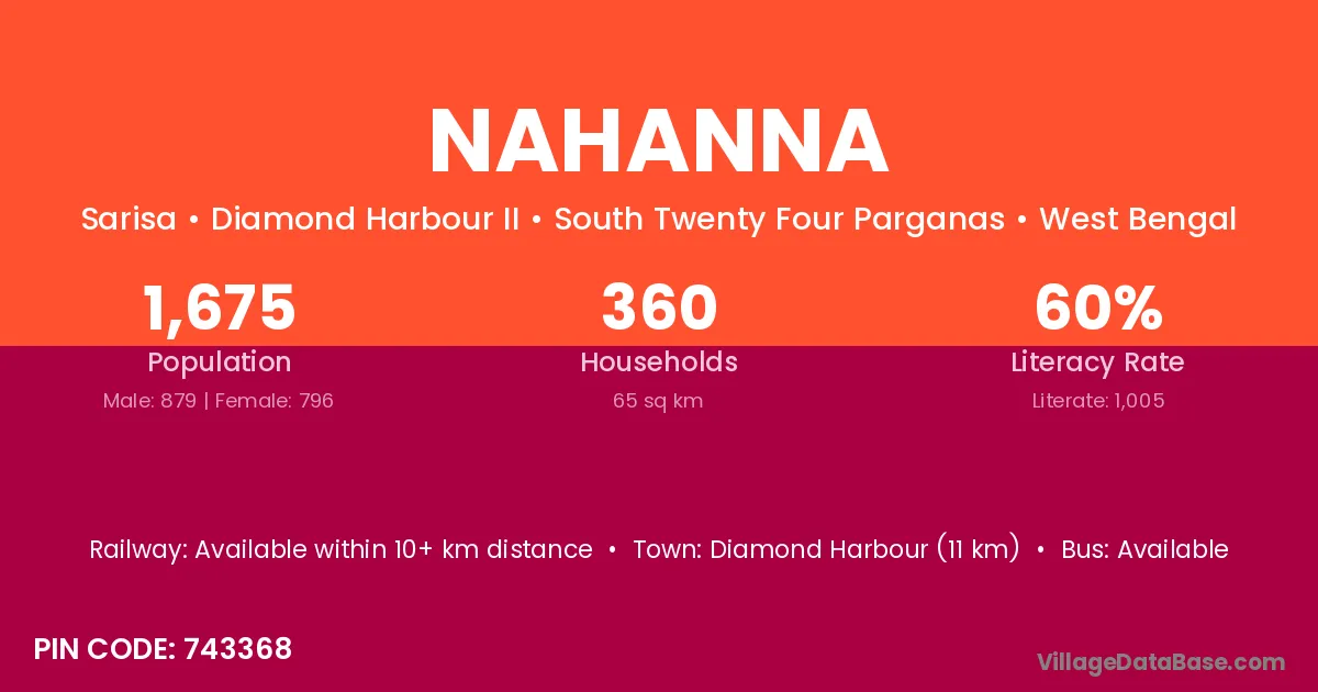 Diamond Harbour (11 km) is the nearest town to Nahanna village for major economic activities and is located approximately 11 km away.