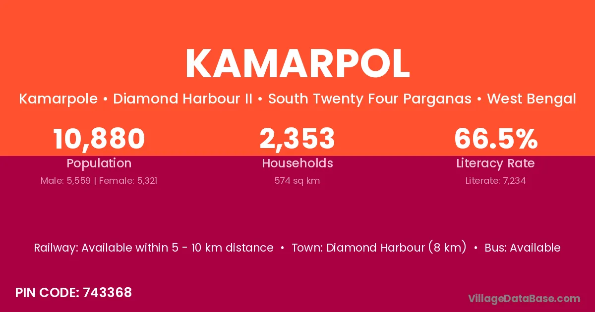 Diamond Harbour (8 km) is the nearest town to Kamarpol village for major economic activities and is located approximately 8 km away.
