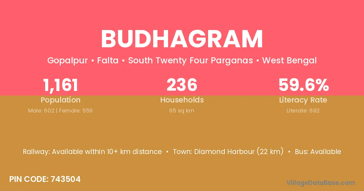 Diamond Harbour (22 km) is the nearest town to Budhagram village for major economic activities and is located approximately 22 km away.