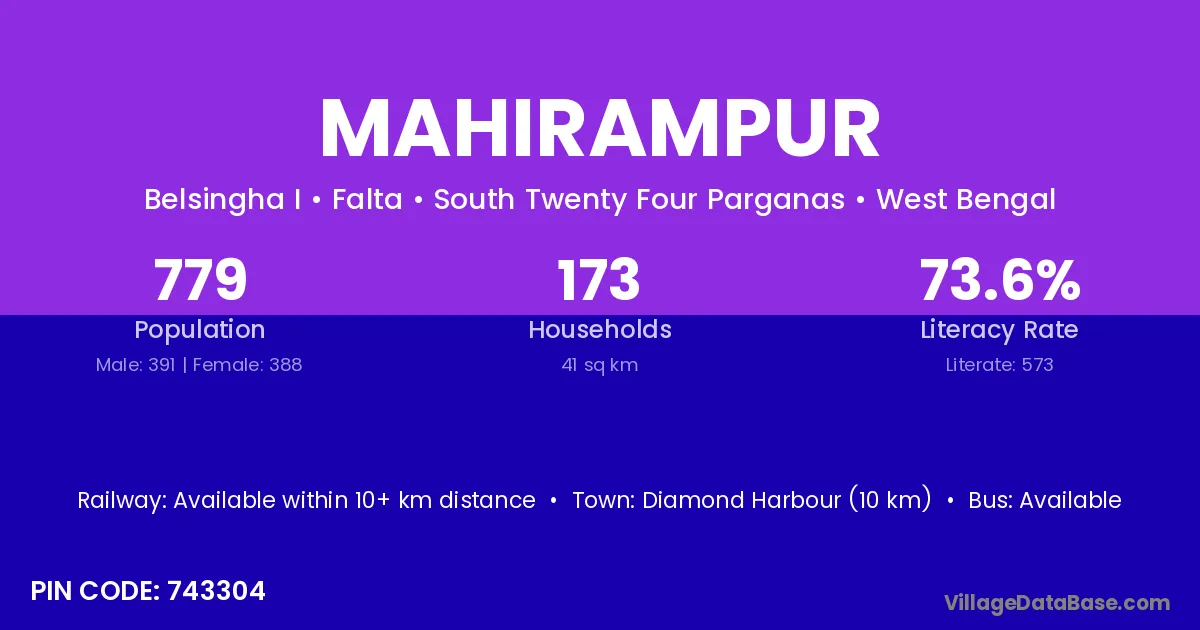 Diamond Harbour (10 km) is the nearest town to Mahirampur village for major economic activities and is located approximately 10 km away.