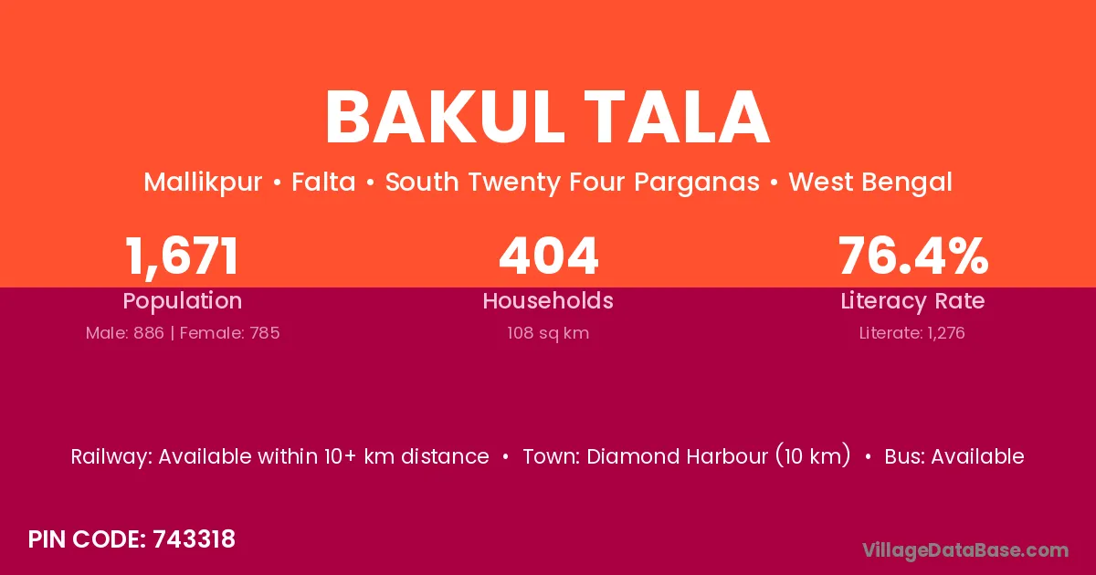 Diamond Harbour (10 km) is the nearest town to Bakul Tala village for major economic activities and is located approximately 10 km away.