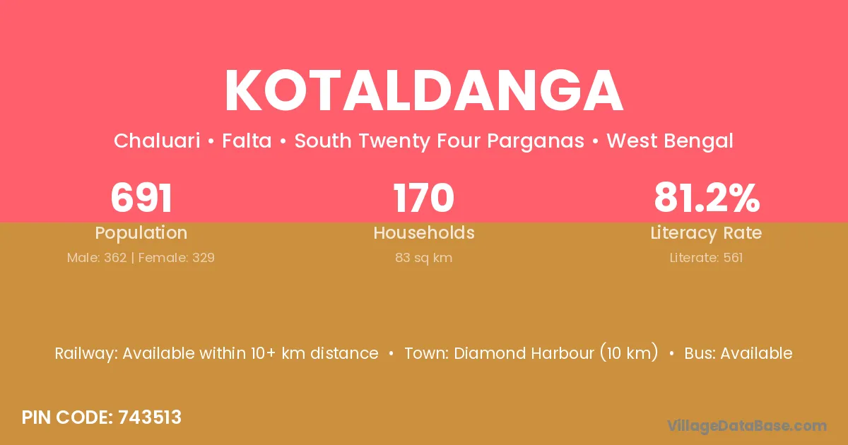 Diamond Harbour (10 km) is the nearest town to Kotaldanga village for major economic activities and is located approximately 10 km away.