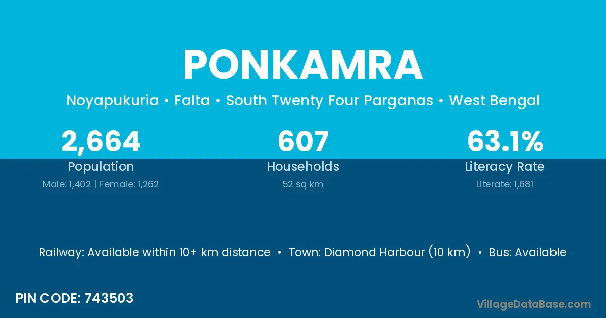 Diamond Harbour (10 km) is the nearest town to Ponkamra village for major economic activities and is located approximately 10 km away.