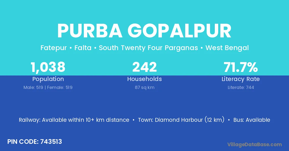 Diamond Harbour (12 km) is the nearest town to Purba Gopalpur village for major economic activities and is located approximately 12 km away.