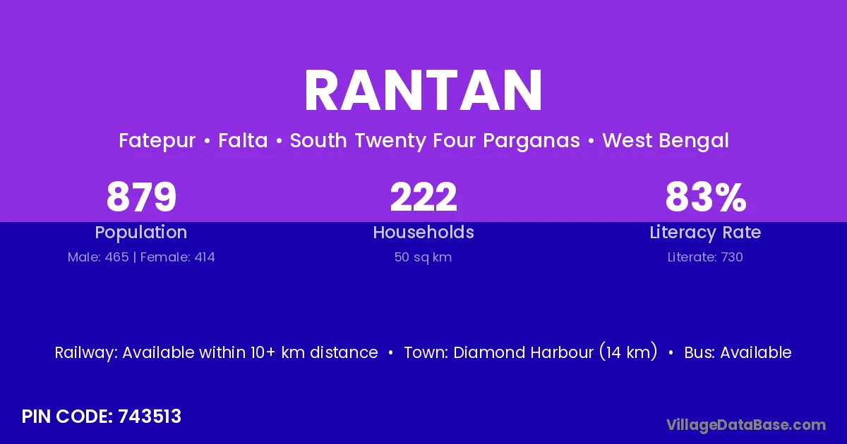 Diamond Harbour (14 km) is the nearest town to Rantan village for major economic activities and is located approximately 14 km away.