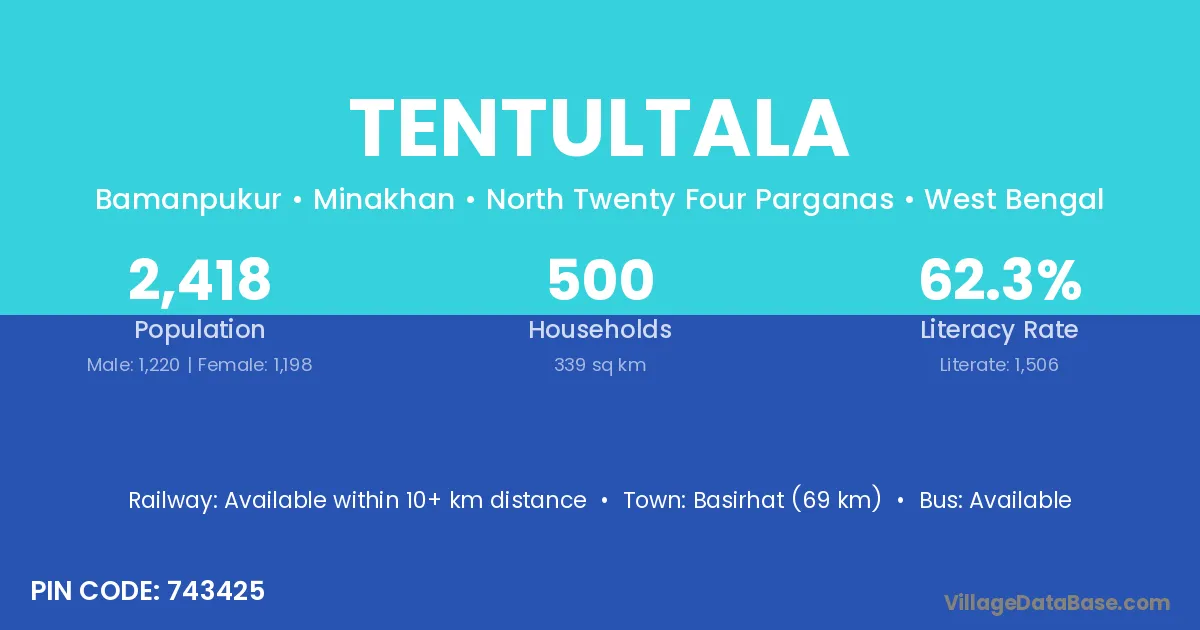 Canning (42 km) is the nearest town to Tentultala village for major economic activities and is located approximately 42 km away.
