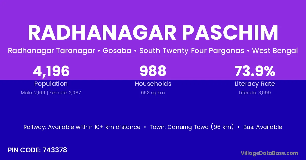 Radhanagar Paschim village has a total population of 4,196 people, of which 2,109 are males and 2,087 are females.