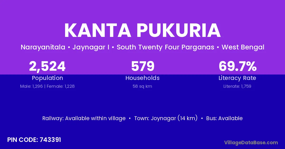 Kanta Pukuria village is located in the Jaynagar I Subdivision of the South Twenty Four Parganas district in West Bengal.