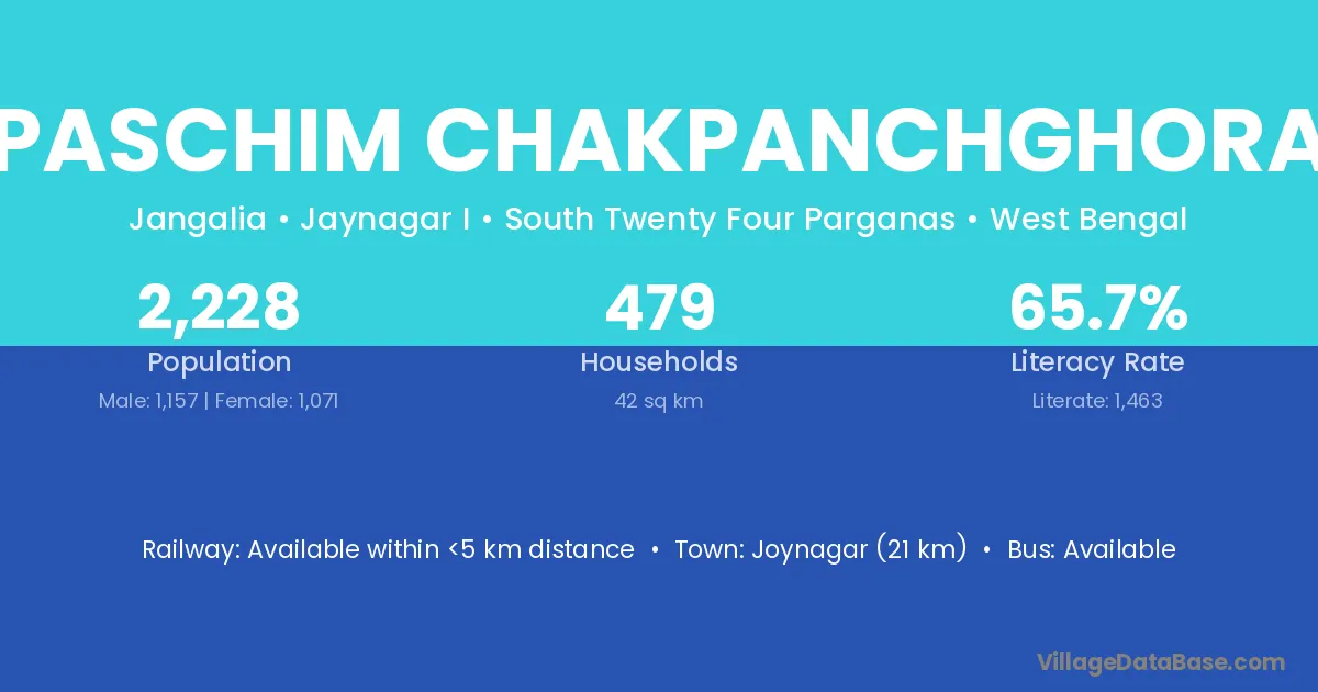 Joynagar (21 km) is the nearest town to Paschim Chakpanchghora village for major economic activities and is located approximately 21 km away.
