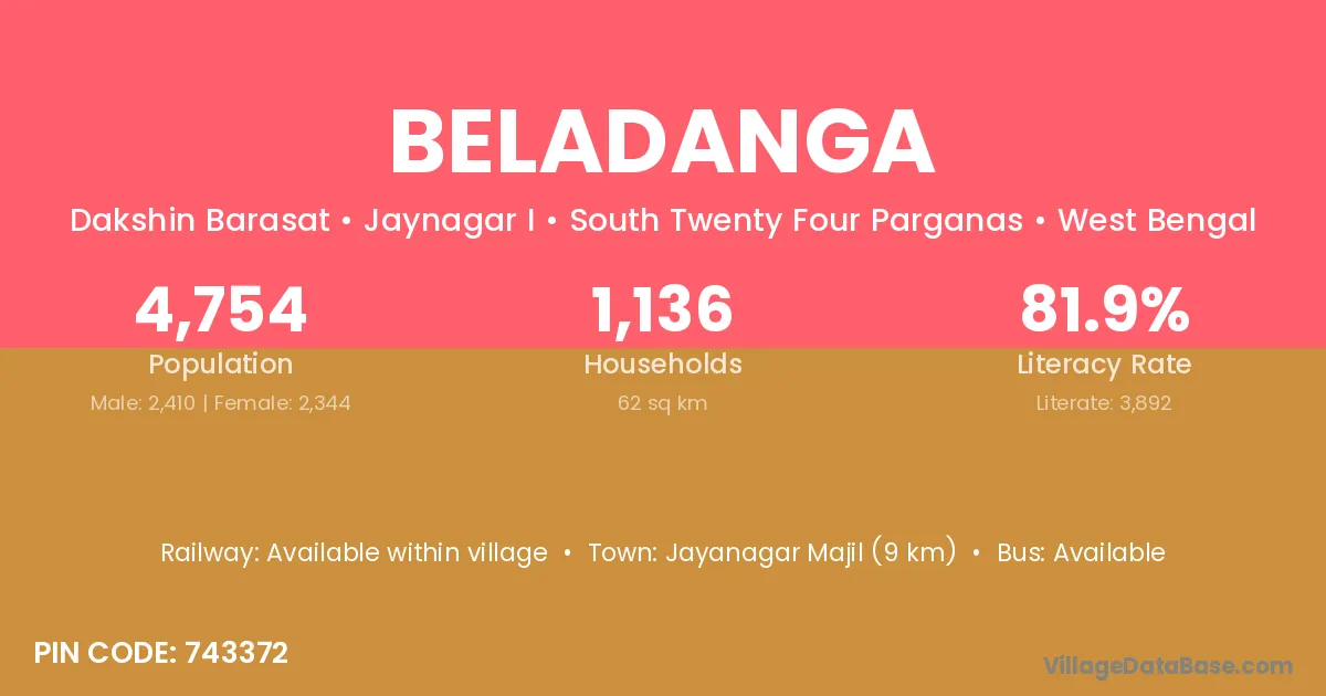 Jayanagar Majil (9 km) is the nearest town to Beladanga village for major economic activities and is located approximately 9 km away.