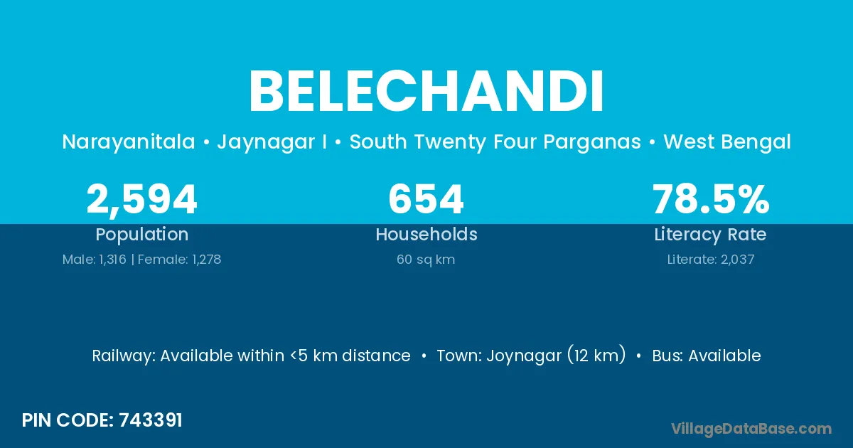 Joynagar (12 km) is the nearest town to Belechandi village for major economic activities and is located approximately 12 km away.