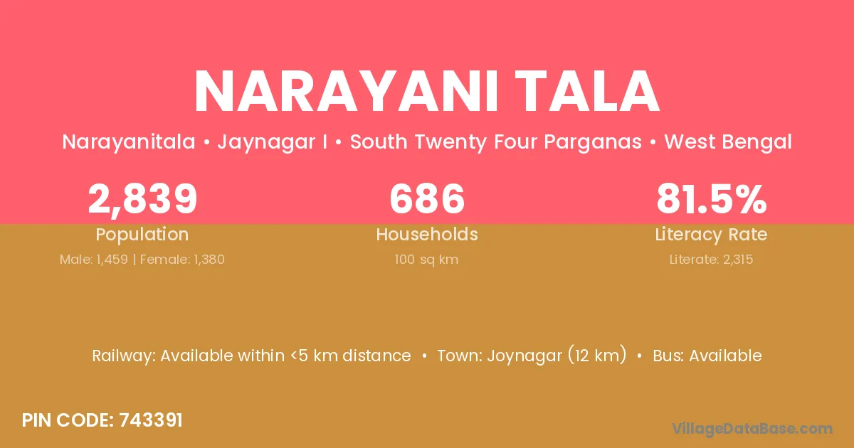 Joynagar (12 km) is the nearest town to Narayani Tala village for major economic activities and is located approximately 12 km away.