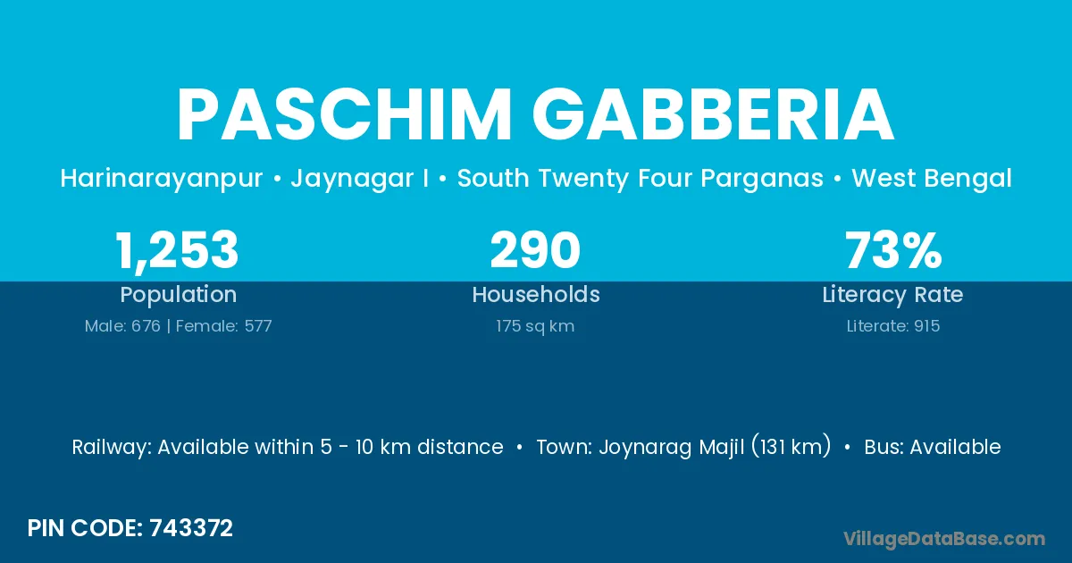Paschim Gabberia village has a total population of 1,253 people, of which 676 are males and 577 are females.