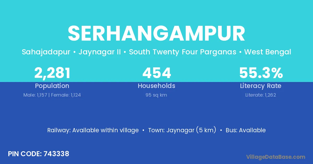 Jaynagar (5 km) is the nearest town to Serhangampur village for major economic activities and is located approximately 5 km away.