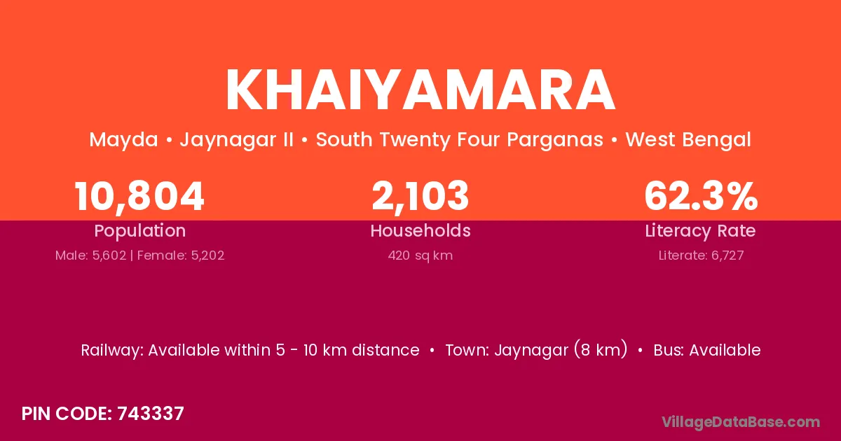 Khaiyamara village has a total population of 10,804 people, of which 5,602 are males and 5,202 are females.