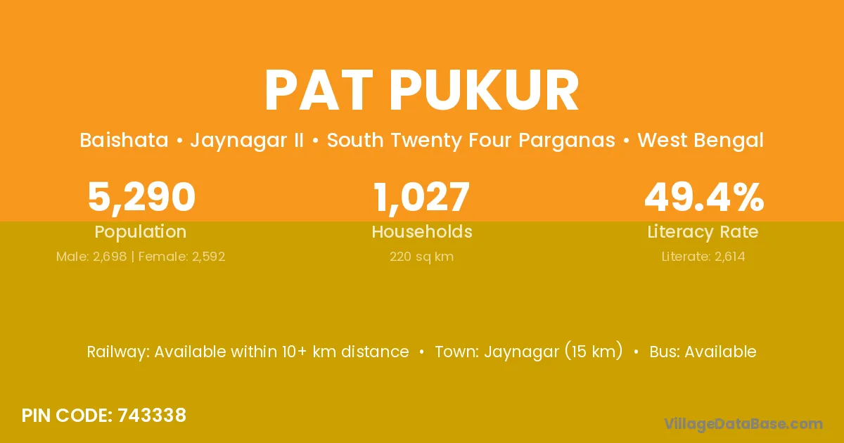 Jaynagar (15 km) is the nearest town to Pat Pukur village for major economic activities and is located approximately 15 km away.