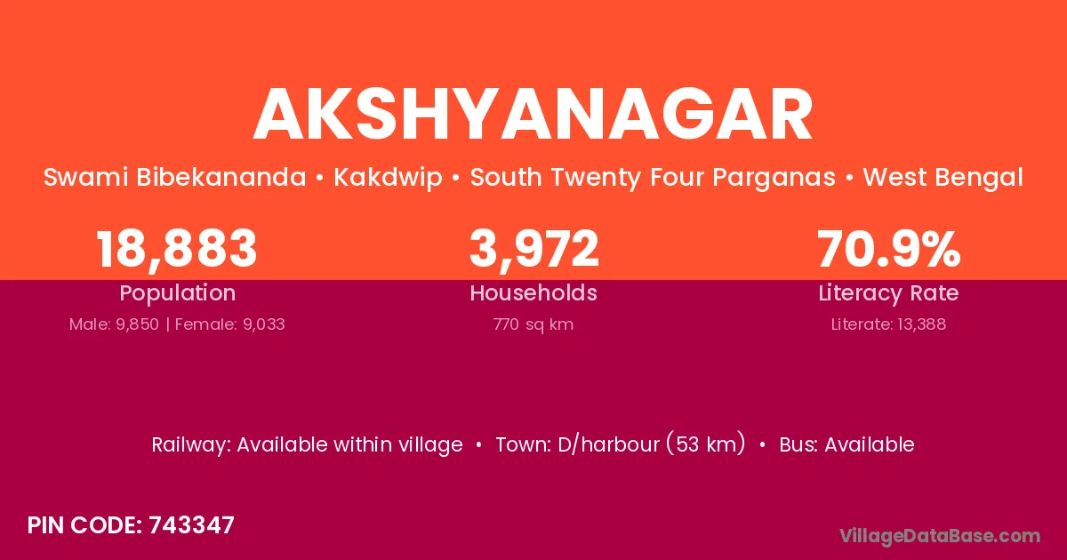 D/harbour (53 km) is the nearest town to Akshyanagar village for major economic activities and is located approximately 53 km away.