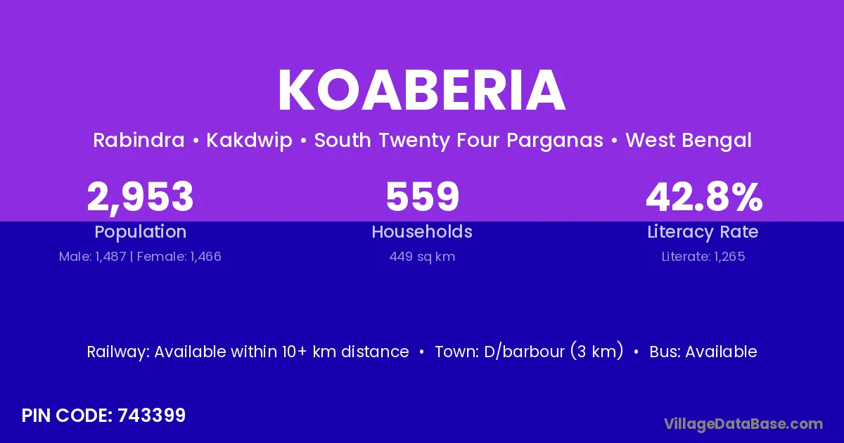 According to Census 2011 information, the village code of Koaberia village is 743399.