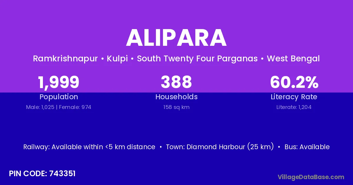 Alipara village is located in the Kulpi Subdivision of the South Twenty Four Parganas district in West Bengal.