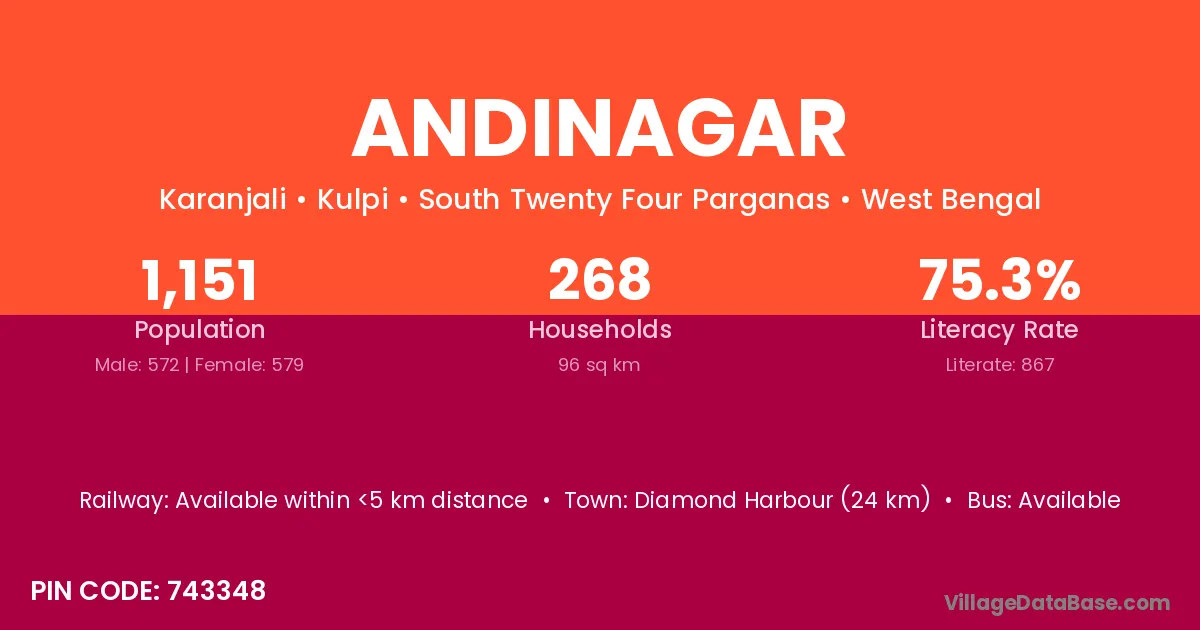 Diamond Harbour (24 km) is the nearest town to Andinagar village for major economic activities and is located approximately 24 km away.