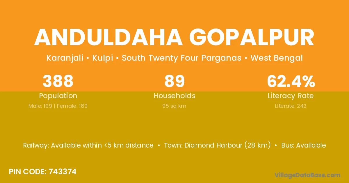 Diamond Harbour (28 km) is the nearest town to Anduldaha Gopalpur village for major economic activities and is located approximately 28 km away.