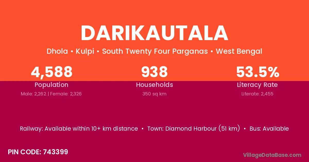 Diamond Harbour (51 km) is the nearest town to Darikautala village for major economic activities and is located approximately 51 km away.