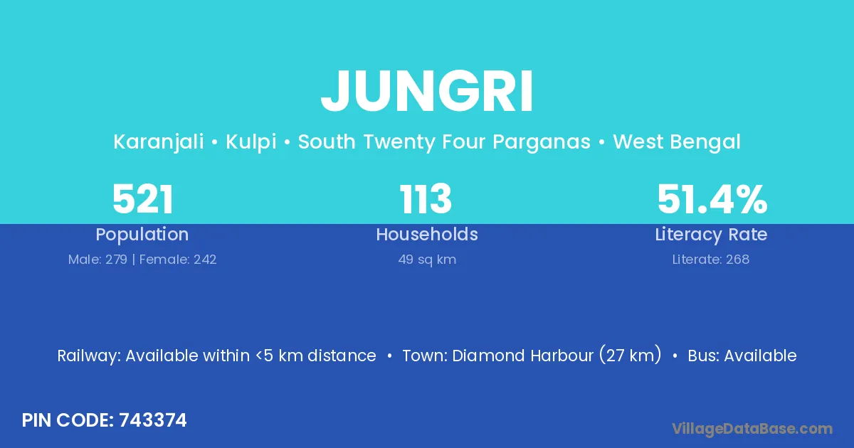 Jungri village is located in the Kulpi Subdivision of the South Twenty Four Parganas district in West Bengal.