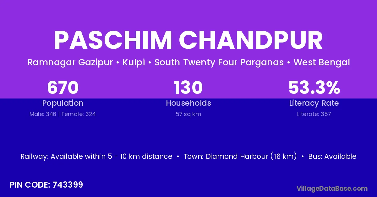 Diamond Harbour (16 km) is the nearest town to Paschim Chandpur village for major economic activities and is located approximately 16 km away.