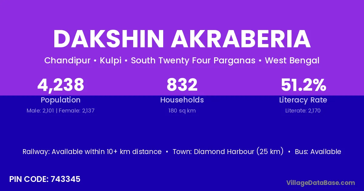 Dakshin Akraberia village is located in the Kulpi Subdivision of the South Twenty Four Parganas district in West Bengal.