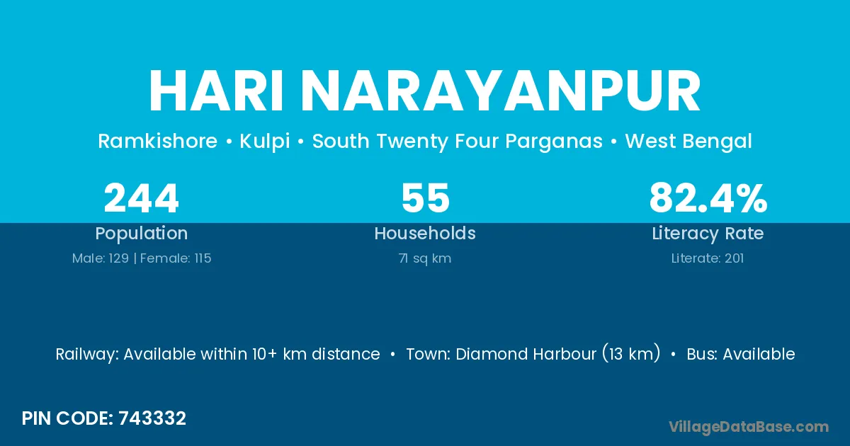 Diamond Harbour (13 km) is the nearest town to Hari Narayanpur village for major economic activities and is located approximately 13 km away.