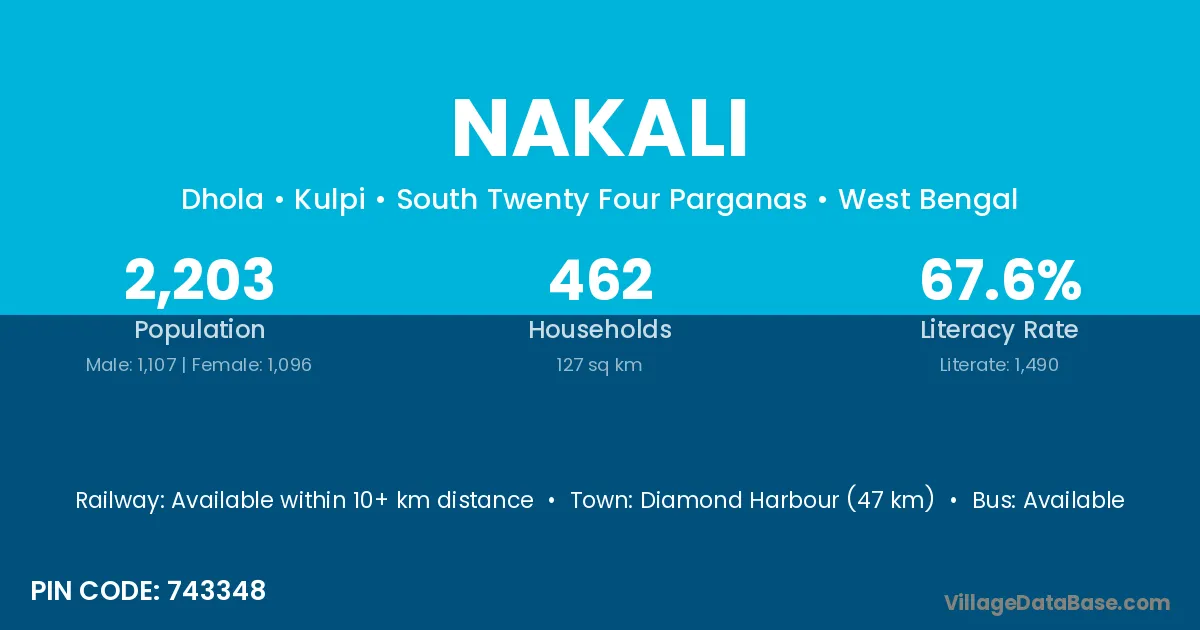 Diamond Harbour (47 km) is the nearest town to Nakali village for major economic activities and is located approximately 47 km away.