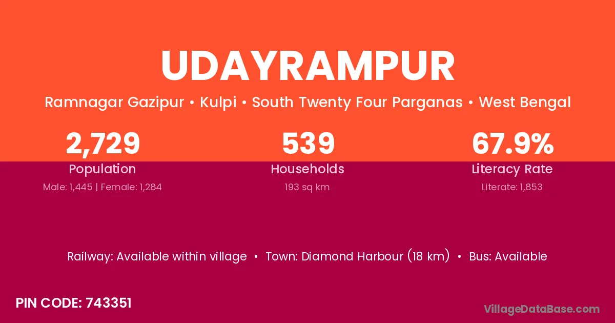 Udayrampur village is located in the Kulpi Subdivision of the South Twenty Four Parganas district in West Bengal.