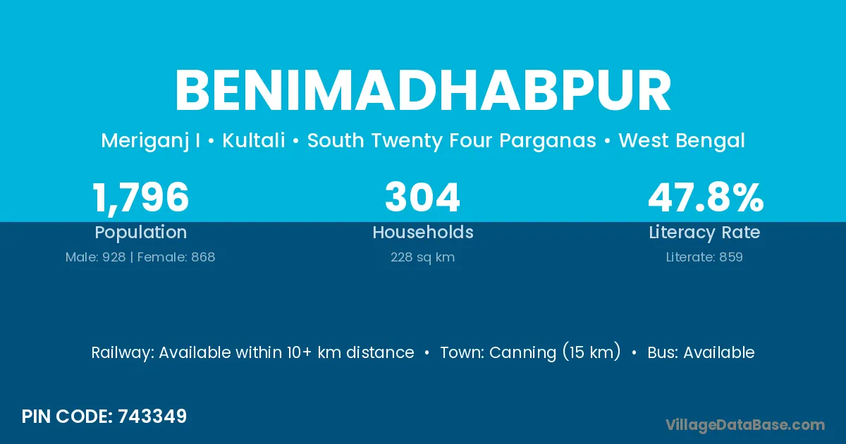 Canning (15 km) is the nearest town to Benimadhabpur village for major economic activities and is located approximately 15 km away.