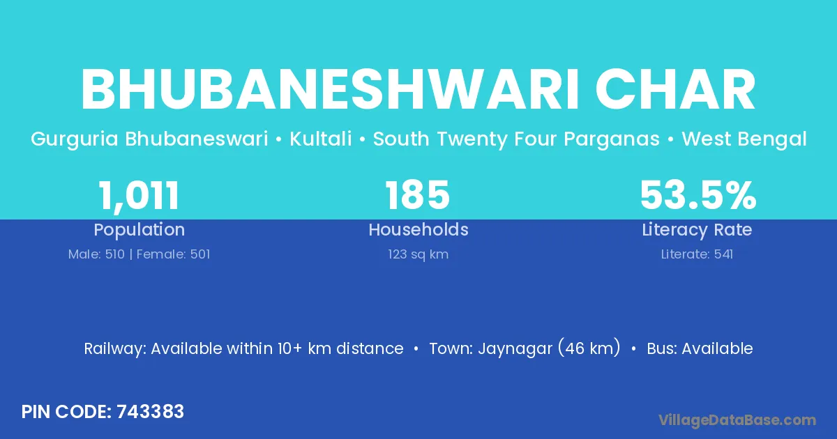 Bhubaneshwari Char village has a total population of 1,011 people, of which 510 are males and 501 are females.