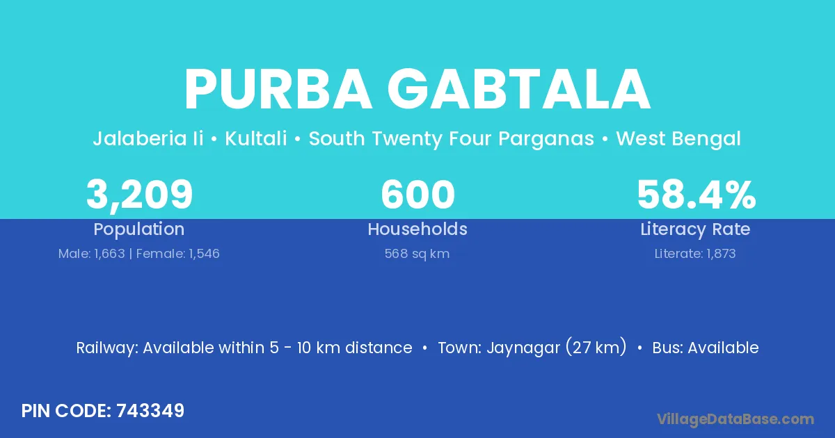 Jaynagar (27 km) is the nearest town to Purba Gabtala village for major economic activities and is located approximately 27 km away.