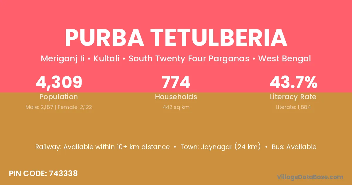 Purba Tetulberia village has a total population of 4,309 people, of which 2,187 are males and 2,122 are females.
