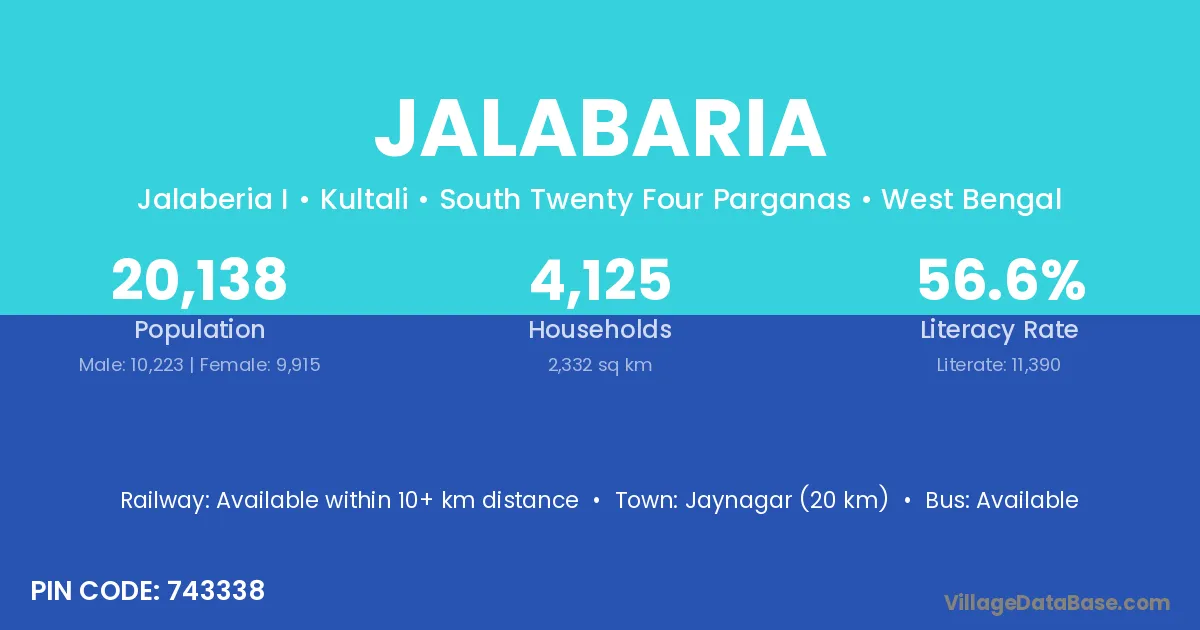 Jalabaria village has a total population of 20,138 people, of which 10,223 are males and 9,915 are females.