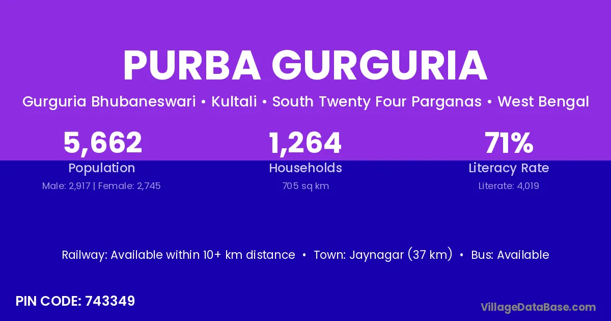 Jaynagar (37 km) is the nearest town to Purba Gurguria village for major economic activities and is located approximately 37 km away.