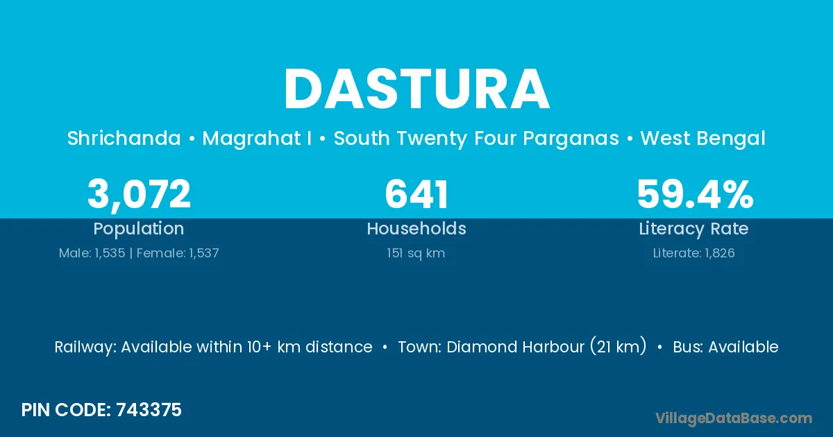Diamond Harbour (21 km) is the nearest town to Dastura village for major economic activities and is located approximately 21 km away.