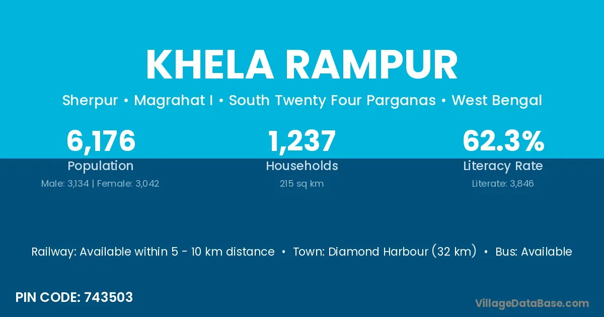 Diamond Harbour (32 km) is the nearest town to Khela Rampur village for major economic activities and is located approximately 32 km away.