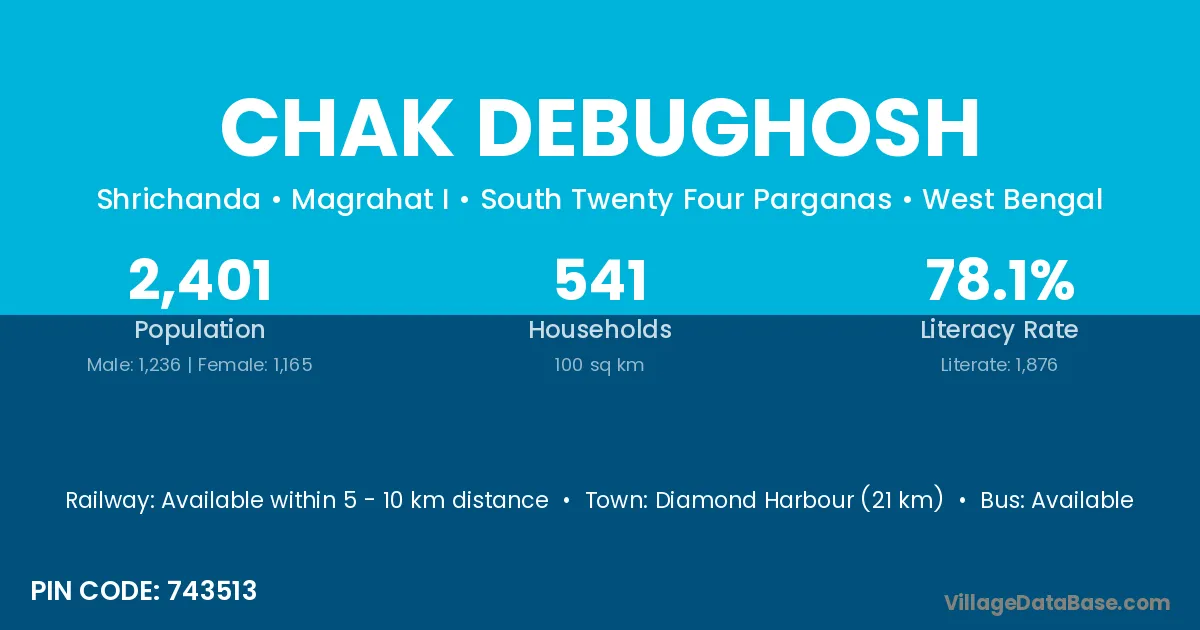 Diamond Harbour (21 km) is the nearest town to Chak Debughosh village for major economic activities and is located approximately 21 km away.